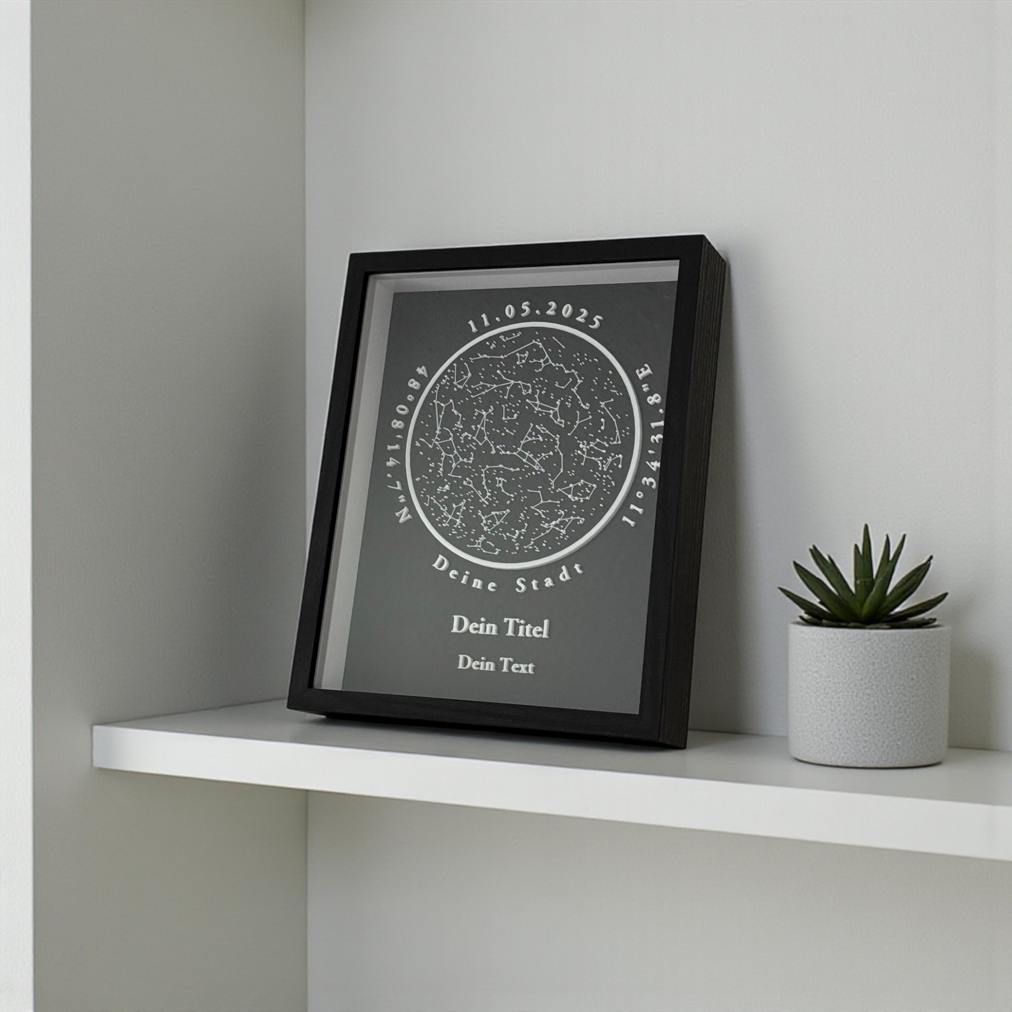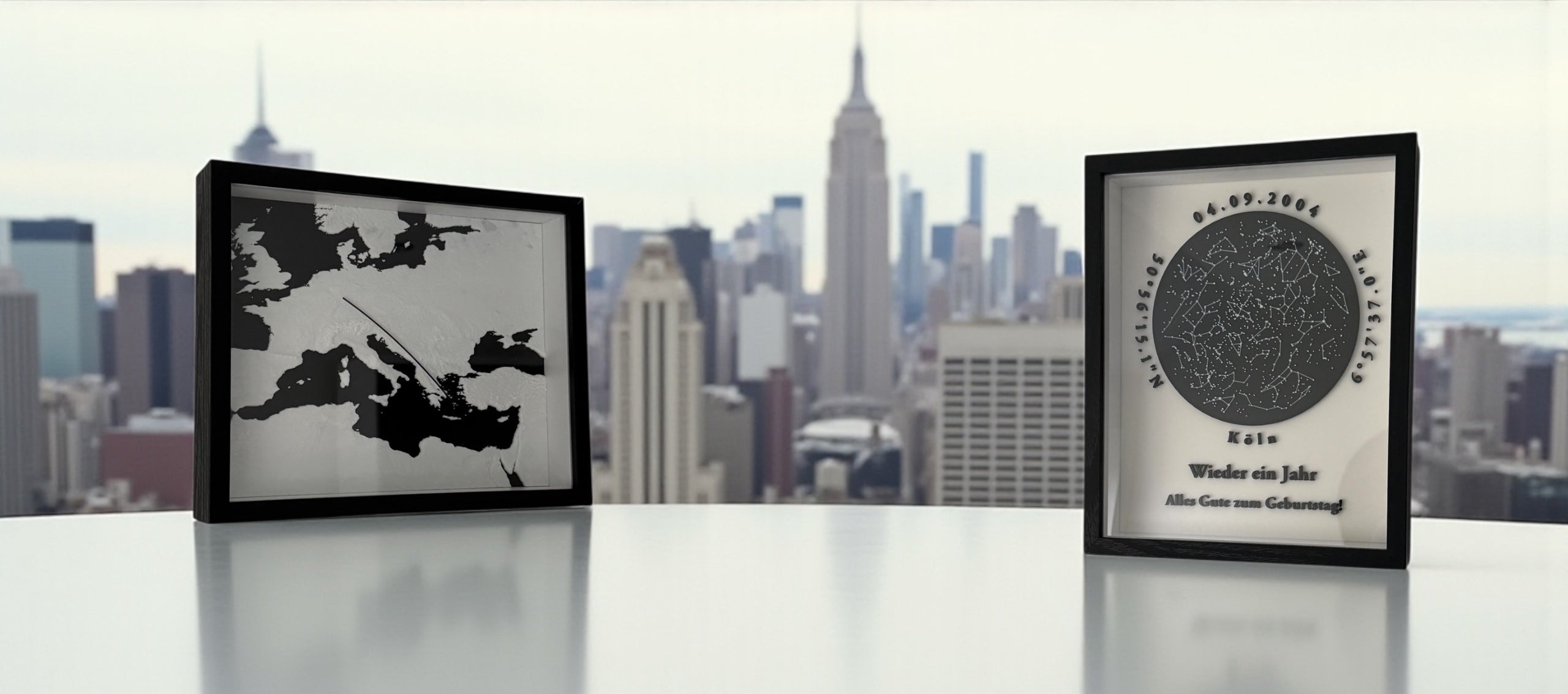 Halte besondere Momente für immer fest – ob als personalisierte Sternenkarte oder als 3D-Flugroute. Jedes Kunstwerk wird individuell nach deinen Wünschen in unserem Bremer Atelier gefertigt und verwandelt deine Erinnerungen in ein einzigartiges Wandbild. Zeitlos, persönlich, handgemacht.